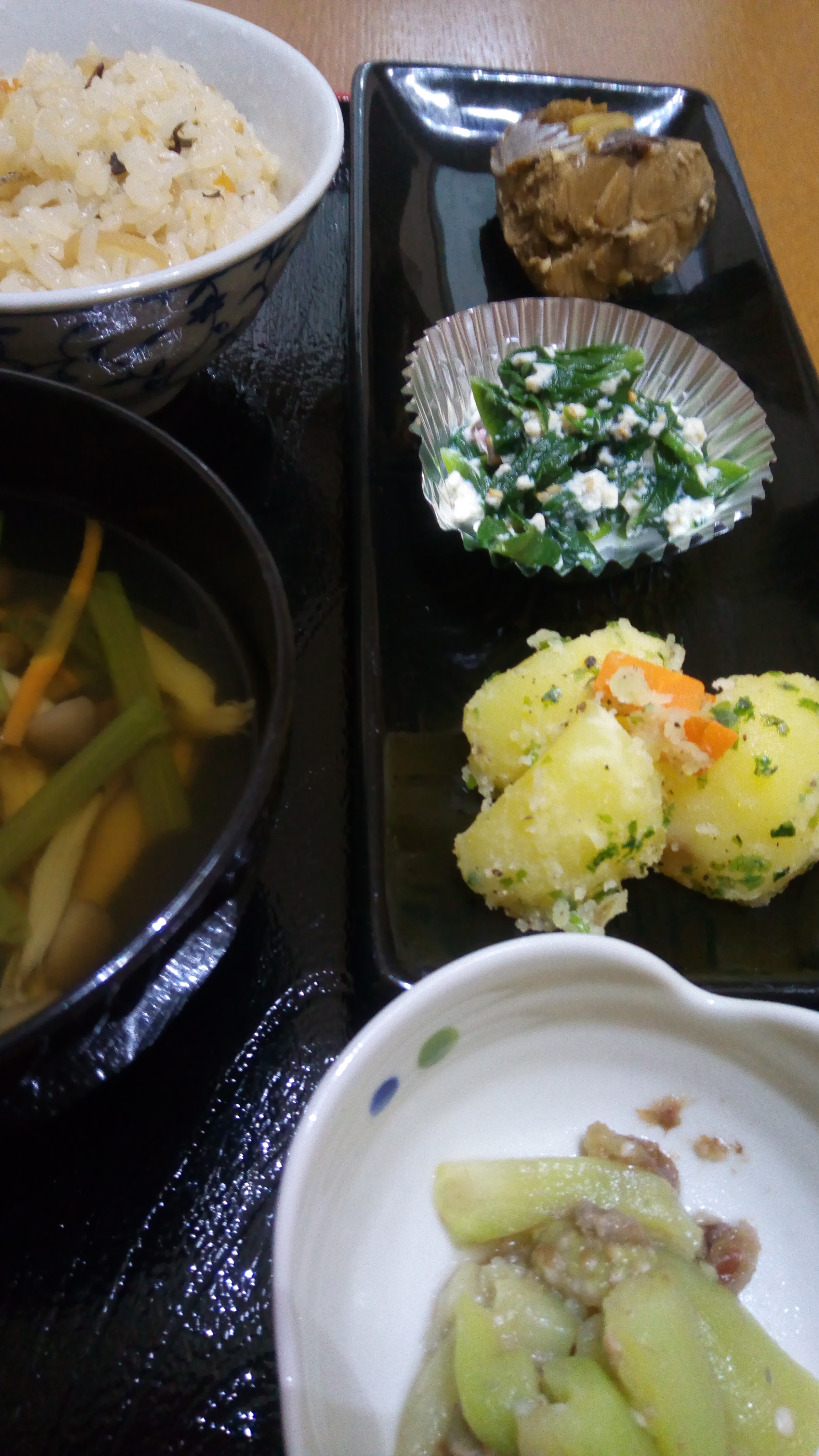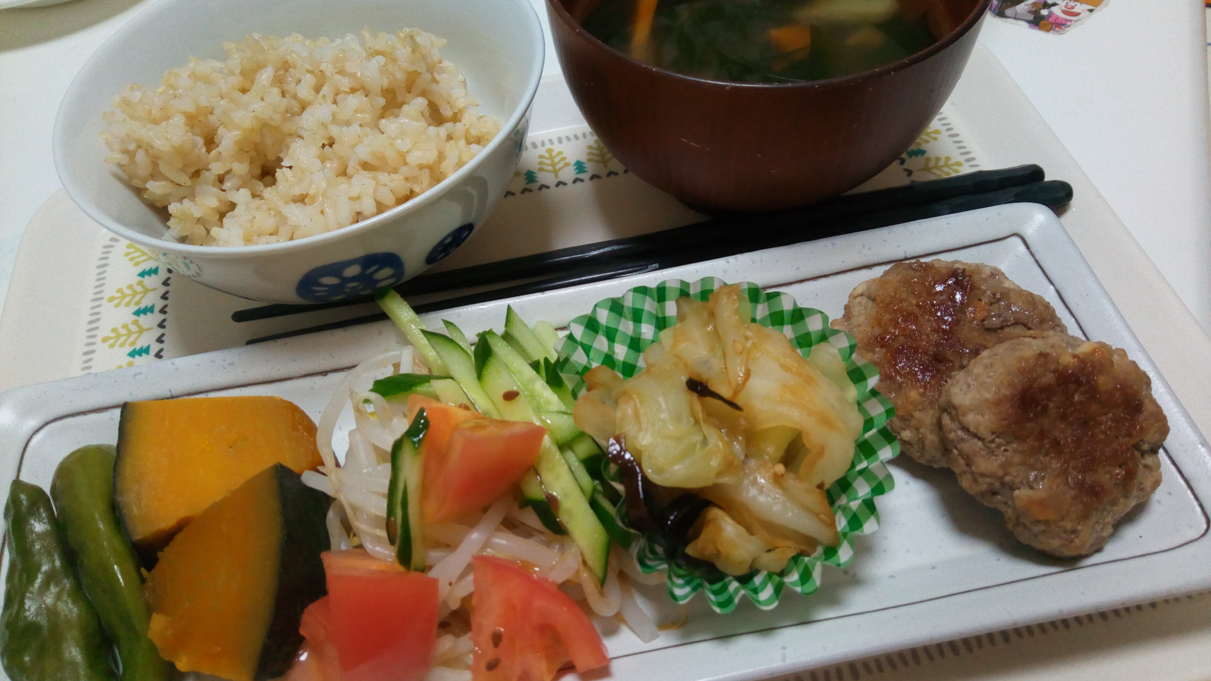 玄米ご飯、野菜スープ(れんこん、にんじん、わかめ)、かぼちゃとししとうの煮物、サラダ、茹でキャベツ昆布和え、ハンバーグ