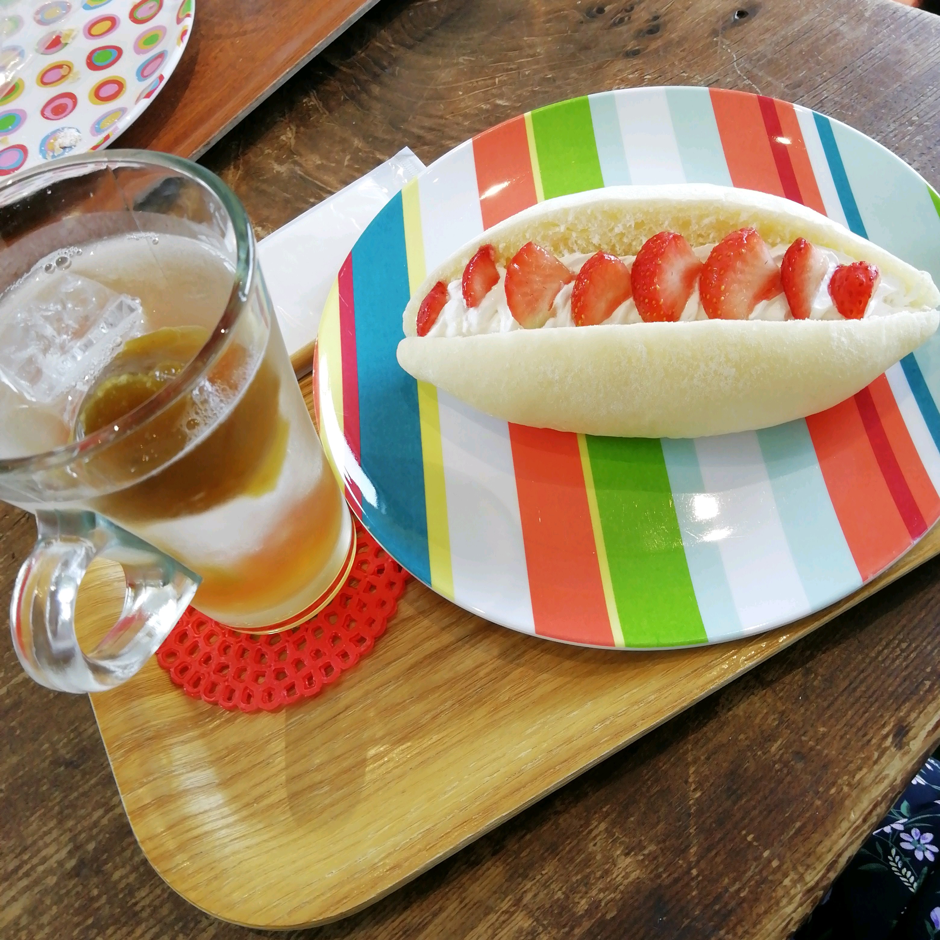デザートに食べた、梅ジュースと苺サンド(* >ω<)パンはふわふわで、梅ジュースはジョッキで飲みたいくらい美味しかった!
