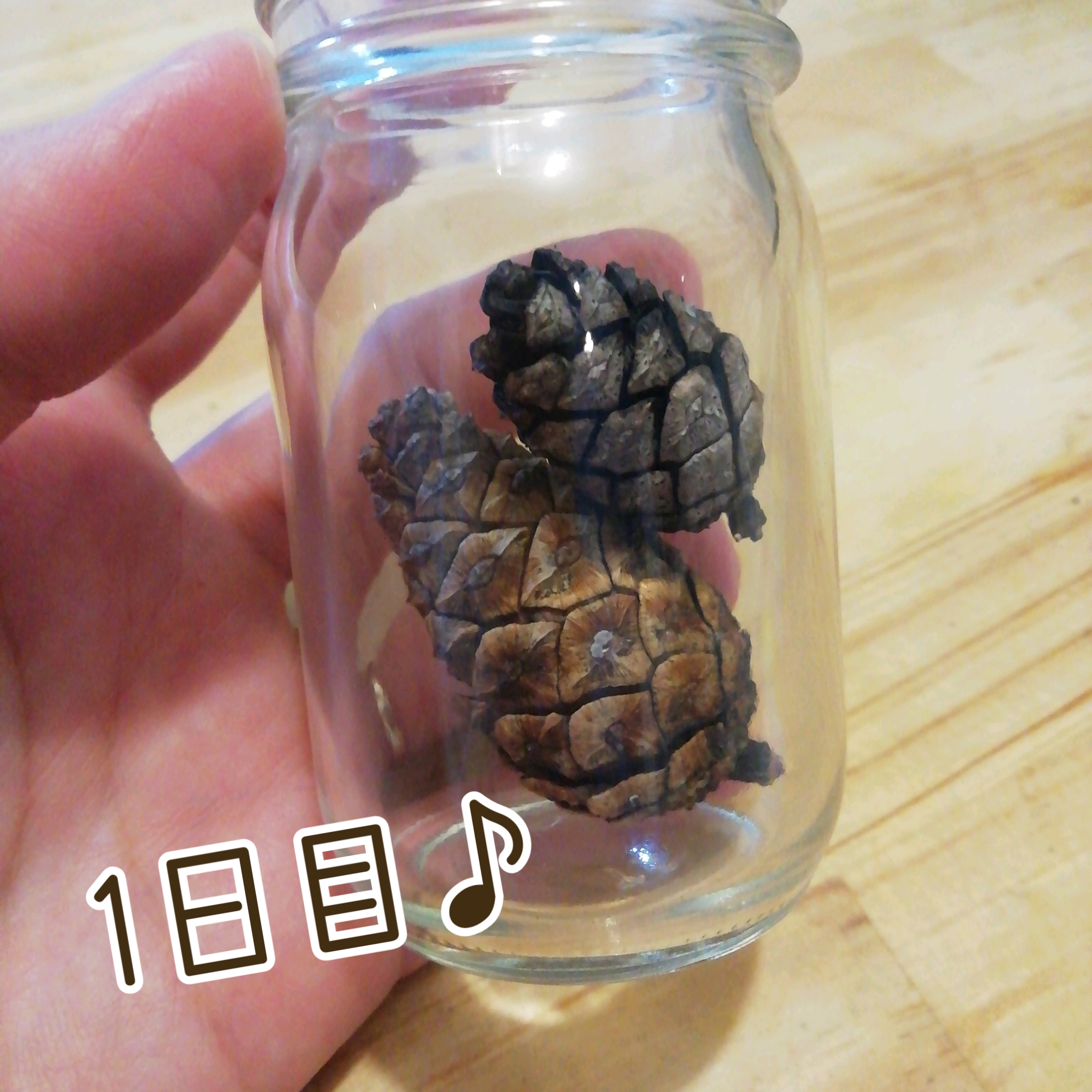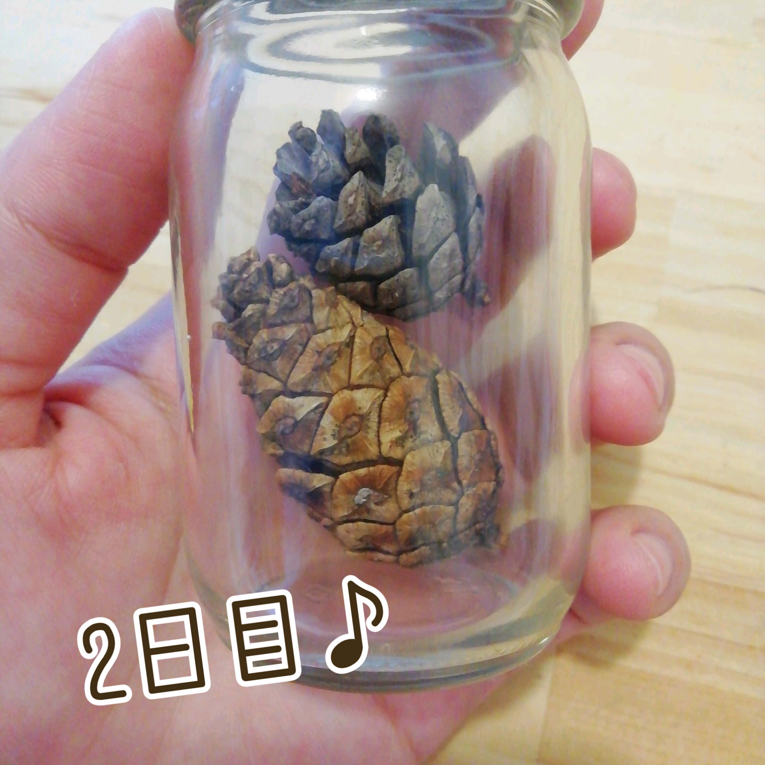 開いたら、びんをひっくり返してもまつぼっくりがでない!!