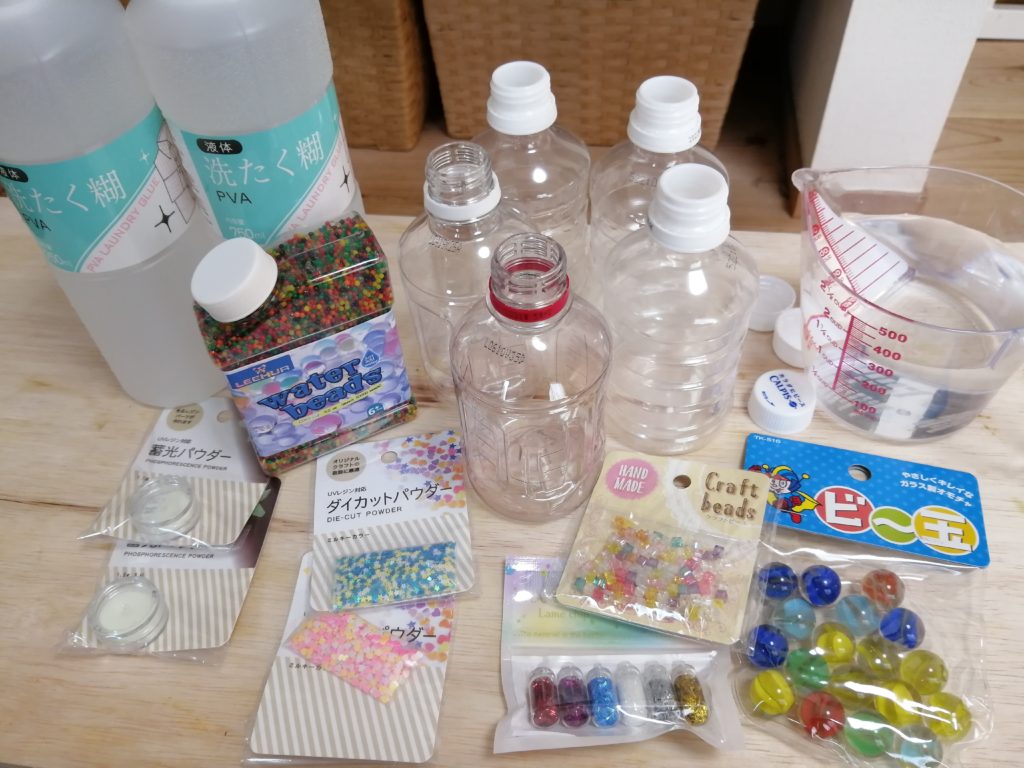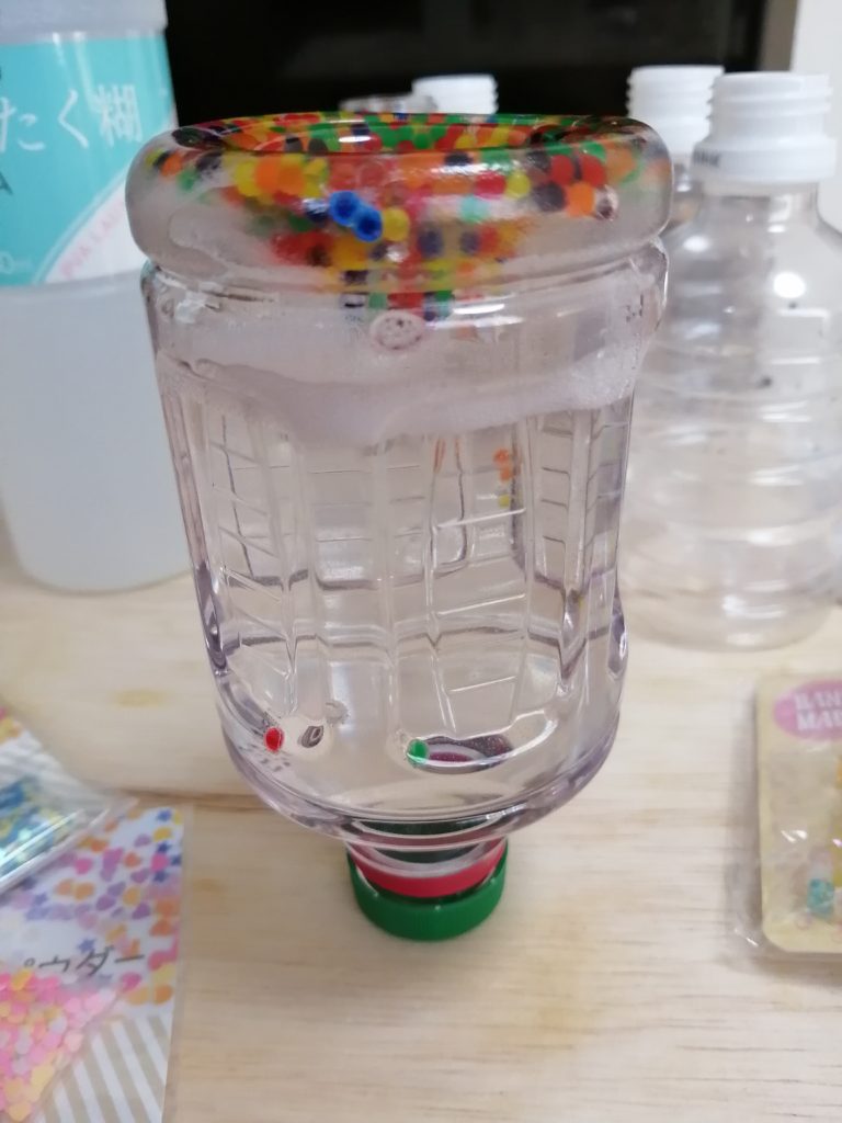 水と洗濯糊を入れたペットボトルに